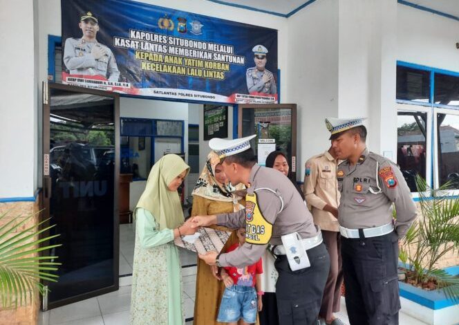 Satlantas Polres Situbondo – Satlantas Polres Situbondo membagikan santunan kepada tiga anak yatim, yakni anak yang menjadi korban kecelakaan lalu lintas di jalur pantura Situbondo, Jawa Timur,